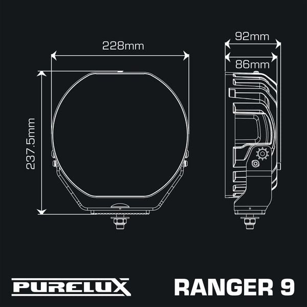 Purelux Ranger 9 on näyttävä ja tehokas 9″ lisävalo, joka on suunniteltu erityisesti maastureiden, pakettiautojen ja raskaan kaluston tarpeisiin. Valaisin on varustettu mm. erittäin kovalla suorituskyvyllä, kahdella eri tehotilalla, R65-hyväksytyllä varoitusvalolla, dynaamisella parkkivalolla sekä upealla designilla – eli kaikella, mitä lisävalolta voidaan tarvita. Ylevän nimensä se lunastaa tuottamalla rajoittamattomassa PowerBoost®-tilassa hurjan 11632 lumenin valotehon ja muodostamalla vaikuttavan, jopa 840 metriin (@ 1 lux) kantavan valokeilan. Vaikka rangerit eivät tunnetusti apujoukkoja kaipaa, voidaan valotehoa sekä valokeilaa kasvattaa entisestään asentamalla ajoneuvon katolle tai keulalle kaksi tai useampi virkaveli rinnakkain partioimaan.