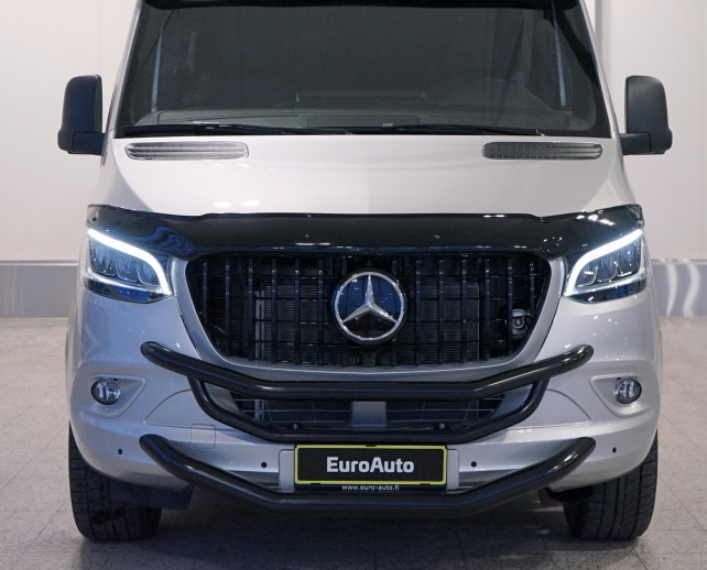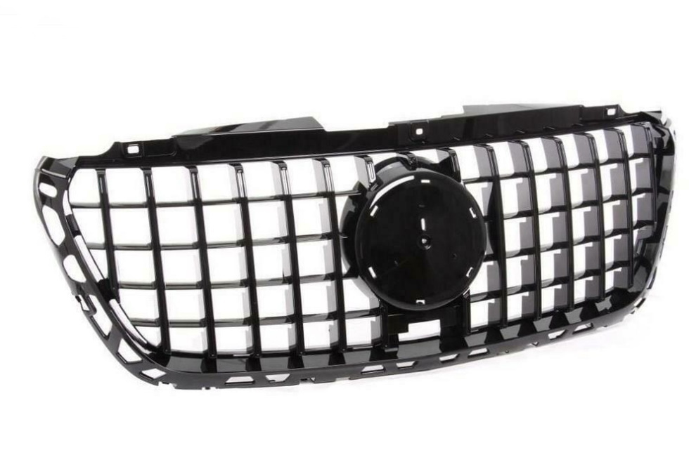 M-B Sprinter W907 GT-R Maski (musta), sopii 6/2018- ja uudempiin autoihin joissa korinvärinen maskin kehys ja kromilistat maskissa. Maski on kokonaan kiiltävä musta ei vaadi maalausta. Alkuperäisen maskin tähti menee heittämällä tähän. Maskissa myös optio 360 kameralle. Jos autossa ei ole kameraa tulee kamera-aukon päälle ”pystylista”. Eli tämä maski sopii autoihin jos tilatessa autoa on ruksittu lisävarusteena maskin kromit ja korinvärinen maskinkehys