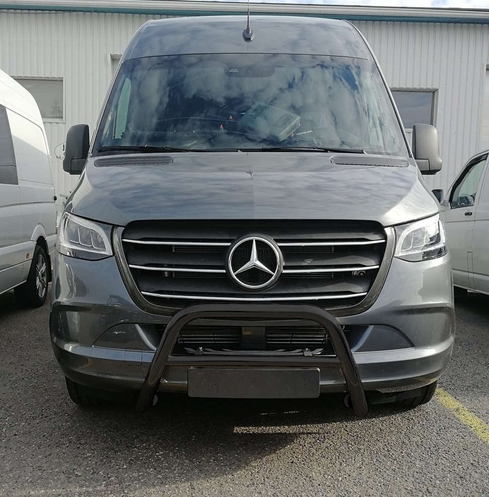 M-B Sprinter W907 Musta valorauta (A-malli), sopii 6/2018- uudempiin autoihin. Huom, tätä rautaa ei voi asentaa autoihin joissa on adabtiivinen vakionopeuden säädin, häiritsee sitä. Ei sovi myöskään etuveto malleihin. Valmistettu 60mm ruostumattomasta teräsputkesta joka on raekuulapuhallettu ja pulverimaalattu puolikiiltäväksi mustaksi. Pakettiin kuuluu valorauta, mallikohtaiset kiinnitysraudat ja ruuvit sekä 2 kpl 60mm putkelle tarkoitettuja lisävalojen kiinnityspantoja jotka toimitetaan kromisena. Huom! Tällä raudalla ei ole EU-hyväksyntää! Kaikissa valotelineissä, jotka asennetaan 25/5/2007 jälkeen rekisteröityihin henkilö- tai alle 3500 kg pakettiautoihin tulee olla EU-hyväksyttyä mallia! Mikäli ajoneuvo on rekisteröity kuorma-autoksi, voi siihen asentaa minkä tahansa valotelineen, eli tämän.