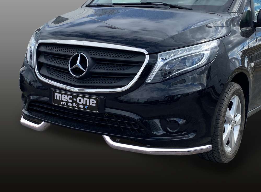 M-B Vito W447 Mec-one etuhelmaputket, sopii 9/2014-2024 vuosimallin autoihin. Sopii myös malleihin joissa parkkitutkat edessä. Valmistettu 60 ruostumattomasta teräsputkesta. Näyttävät kulmaputket. Paketti sisältää 2 kpl putkia, kiinnitystarvikkeet ja ohjeet. Ei sovi autoon jossa AMG-Line etupuskuri. Kotimainen tuote! Ei sovi 4/2024- ja uudempiin vitoihin.
