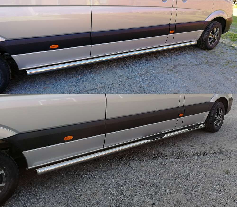 VW Crafter 2017-> Kylkiputket 2-in-1, sopii 2017- ja uudempaan pitkään L3 ja extra pitkään L4 malliin etuveto (akseliväli 4490mm). Valmistettu 76mm ruostumattomasta teräsputkesta, joka on kiillotettu peilikirkkaaksi. Pakettiin kuuluu 2 kpl kylkiputkia, mallikohtaiset kiinnitysraudat, ruuvit, 3 kpl muoviaskelmia putkien päälle sekä ohjeet. Muoviaskelmat toimitetaan irrallisena, joten ne voi halutessaan jättää kokonaan asentamatta tai sitten voi itse asentaa helpottamaan putken päälle astumista. Askelmat tulee popniiteillä kiinni, jotka myös toimitetaan paketin mukana. Tästä nimitys 2-in-1 koska samaa putkea voidaan käyttää kahden mallisena. L3 ja L4 koriin sopii saman mittaiset putket. Ei sovi takaveto ja 4×4 mallin.