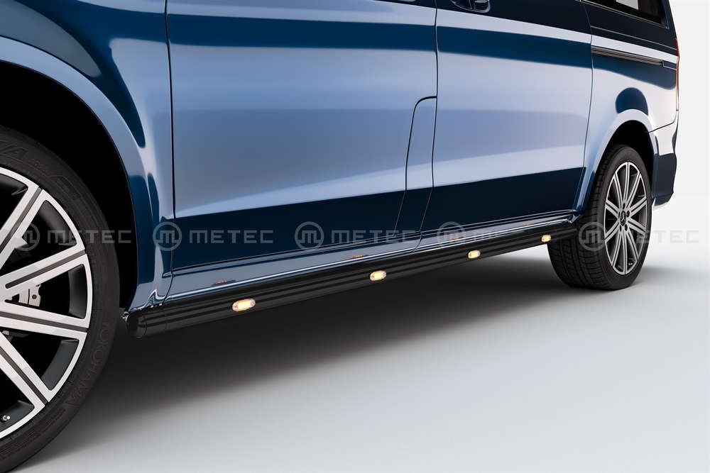 VW Transporter T6, T6.1 Mustat LED-Kylkiputket, sopii 2015- ja uudempiin pitkään malliin. Valmistettu 60mm ruostumattomasta teräsputkesta joka on pulverimaalattu mustaksi. Kylkiputkissa 5 kpl / sivu oransseja LED-valoja. Pakettiin kuuluu 2 kpl kylkiputkia, mallikohtaiset kiinnitysraudat ja ruuvit sekä ohjeet. Valmistaja Metec.